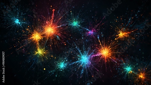 Colorful abstract digital art with glowing particles on a dark background.