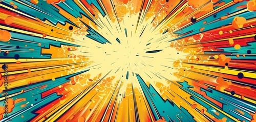 Colorful abstract explosion design, featuring vibrant orange, yellow, and blue shades with dynamic lines and energetic bursts.