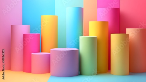Colorful abstract geometric shapes, pastel-hued cylinders, cubes, and rolls, soft gradient background in vibrant rainbow colors, minimalist composition, clean lines.