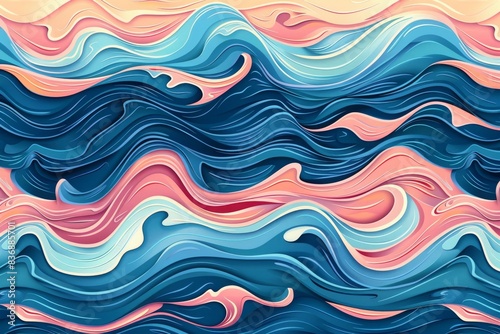 Colorful abstract ocean waves art shades blue pink. Vibrant swirling patterns create dynamic fluid contemporary artwork.