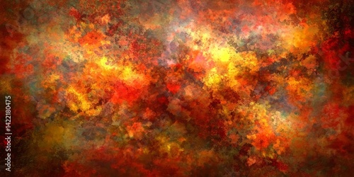 Colorful abstract painting with a lot of red and yellow. The painting has a lot of texture and he is a mix of different colors