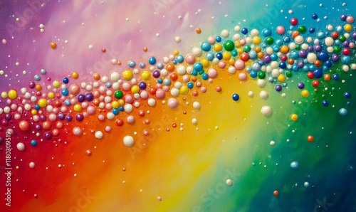 Colorful, abstract painting with a rainbow background and a lot of small, colorful balls scattered throughout.