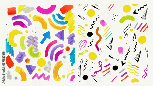 Colorful abstract pattern with geometric shapes and brush strokes on a white background design element