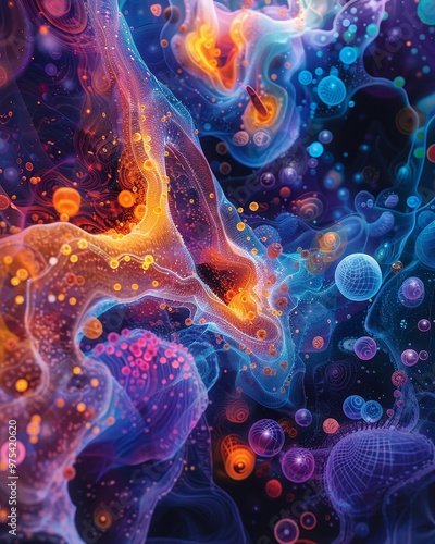 Colorful abstract patterns with vibrant swirls and luminous bubbles create a mesmerizing visual experience.
