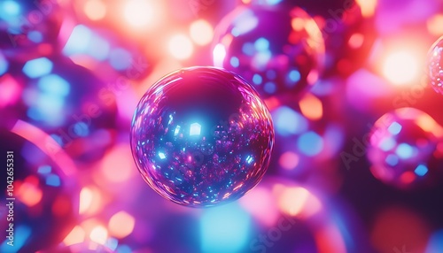 Colorful, abstract spheres glimmer against a vibrant, glowing background, creating a dynamic and futuristic visual experience.