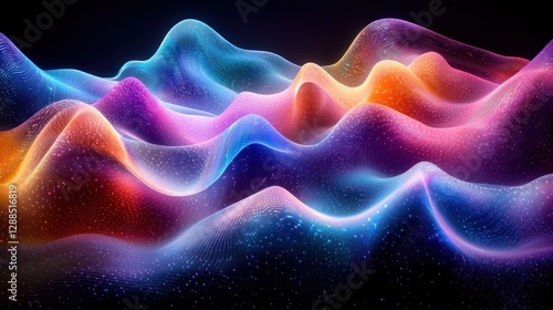 Colorful, Abstract Waves Flow in a Dark Digital Landscape with Glowing Particles