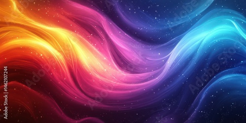 Colorful abstract waves of light swirl across a dark starry background creating a vibrant cosmic display