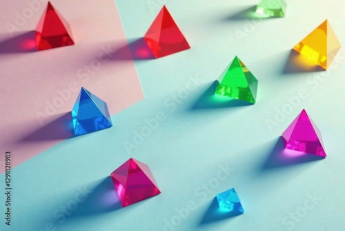 Colorful Acrylic Pyramids Arranged on a Two-Tone Surface Displaying Shadow Effects