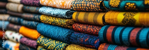 Colorful African fabric rolls displaying a rich array of patterns and hues for fashion, crafts, and cultural celebrations. Traditional textiles with intricate designs suitable for clothing, accessorie