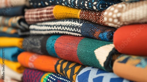 Colorful African fabric rolls displaying a rich array of patterns and hues for fashion, crafts, and cultural celebrations. Traditional textiles with intricate designs suitable for clothing, accessorie