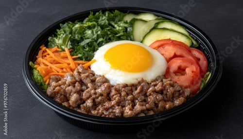 Colorful and delicious bowl of beef with vegetables, topped with a sunny-side-up egg, perfect for healthy eating and meal prep.
