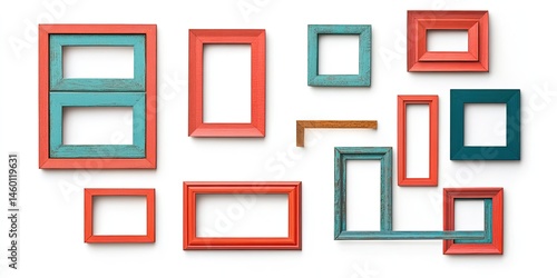 Colorful Arrangement of Rustic Picture Frames on White Background: A Decorative Still Life