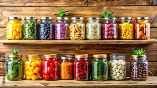 Colorful array of assorted jars filled with vitamins, minerals, and dietary supplements, arranged on a wooden shelf, highlighting a healthy lifestyle and wellness routine.