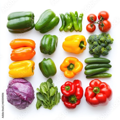 Colorful array of fresh vegetables. Arrangement of peppers, tomatoes, broccoli, and more, laid out in a grid pattern on a white background