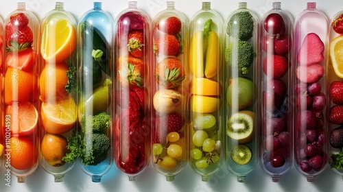 Colorful array of fruits and vegetables encapsulated in transparent capsules, symbolizing natural nutrition and holistic wellness solutions.