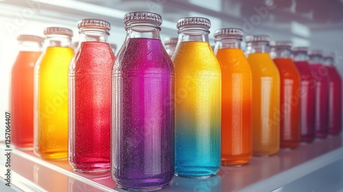 Colorful array of glass bottles filled with vibrant beverages on a refrigerator shelf, illuminated