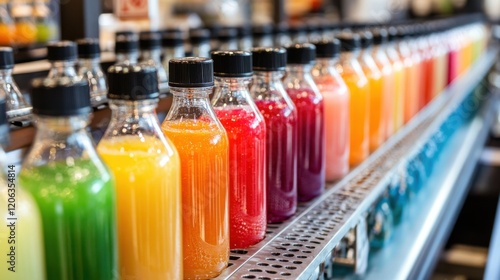 Colorful array of juice bottles displayed on a shelf in a vibrant marketplace setting