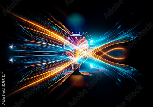Colorful arrows flow in and out of a lightbulb illuminated by a spotlight, representing idea generation and directional concepts.