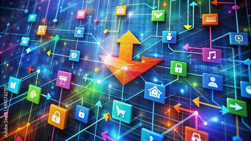 Colorful arrows intersecting in a matrix, surrounded by icons of diverse products, symbolizing cross-selling strategies and effective sales growth opportunities in e-commerce business.