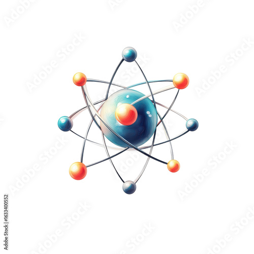 Colorful artistic atom model, showcasing electrons orbiting a nucleus, ideal for science education and technology presentations on transparent background