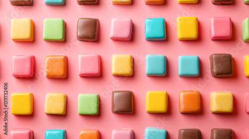 Colorful assorted candies on pink background in neat rows for sweet confectionery display