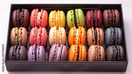 Colorful Assorted Macarons in a Box - Vibrant French Pastries Displayed in a Neat Row - Perfect for Dessert, Bakery, and Culinary Themes