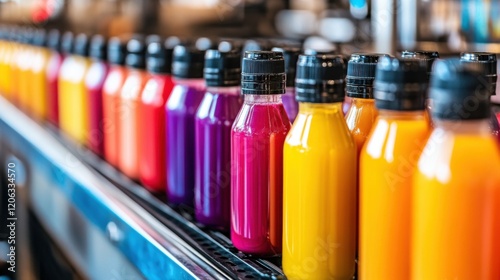Colorful assortment of beverage bottles lined up on a shelf in a vibrant caf? setting