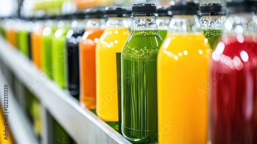 Colorful assortment of bottled beverages lined up on a shelf in a vibrant market setting