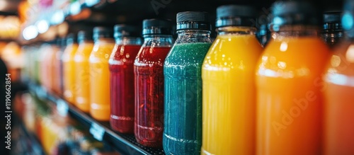Colorful Assortment of Bottled Beverages on Store Shelf in Vibrant Supermarket Aisle Display