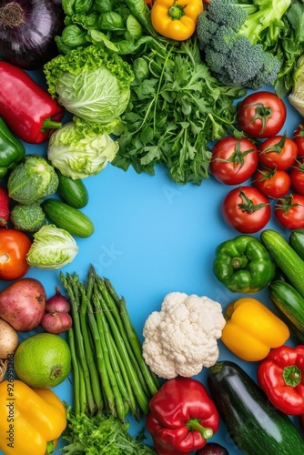 Colorful Assortment of Fresh Vegetables on Blue Background with Copy Space