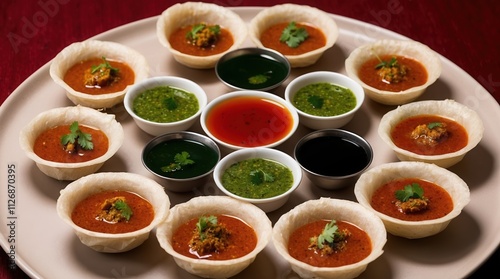 Colorful assortment of Indian street food served in edible cups, featuring various spicy chutneys and garnishes, creating a vibrant culinary display.