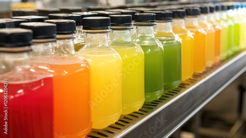 Colorful assortment of juice bottles lined up on a shelf in a vibrant beverage production area