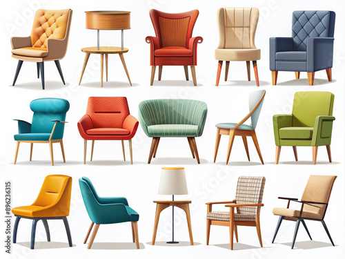Colorful assortment of modern chairs in flat design style, including armchairs, lounge chairs, and stools, isolated on a clean white background, ideal for interior design concepts.