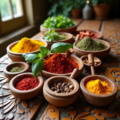Colorful assortment of spices and herbs arranged in wooden bowls and spoons on a rustic table