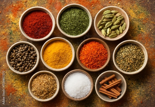 Colorful Assortment of Spices in Bowls on Rustic Surface