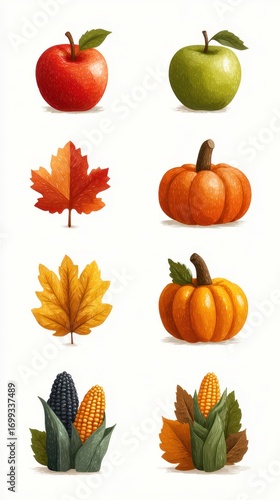 Colorful autumn harvest with apples, pumpkins, leaves, and corn displayed in an artistic arrangement