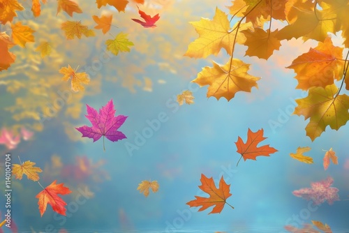 Colorful autumn leaves drifting gently above a serene pond at sunset