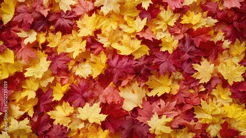 Colorful Autumn Mosaic Featuring Bright Yellow and Deep Red Maple Leaves on a Rustic Wooden Surface in a Nature Setting
