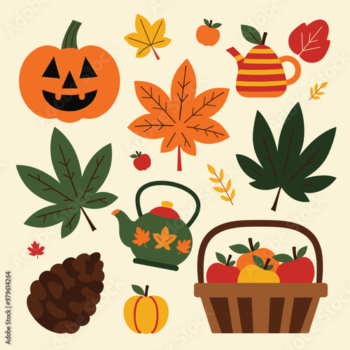Colorful autumn-themed illustration with leaves, pumpkins, apples, and other seasonal elements.