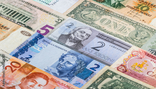 Colorful background with current and old banknotes from some countries.