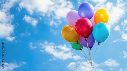 Colorful balloons floating against a bright blue sky with fluffy clouds creating a cheerful and festive atmosphere for celebrations.