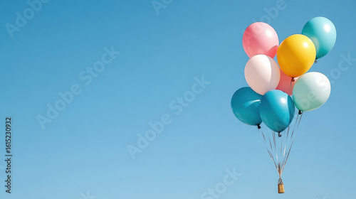 Colorful balloons floating against clear blue sky create joyful atmosphere