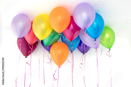 Colorful balloons in the interior of a white room background