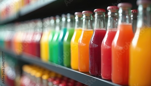 Colorful beverage bottles on store shelf display. Variety of refreshing drinks in a supermarket. Assortment of juices, sodas, liquids. Rainbow colors of tasty chilled drinks.