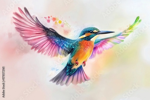 Colorful bird with a long beak is flying in the air. The bird is surrounded by a splash of colors