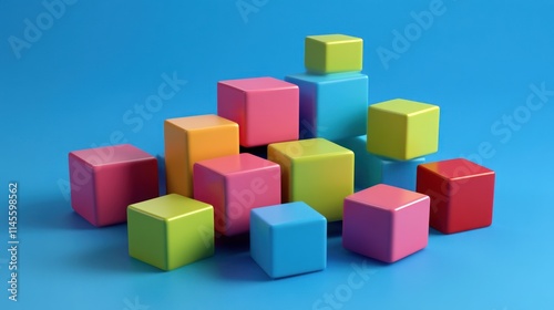 Colorful Blocks Abstract Composition: A vibrant arrangement of glossy cubes on a blue background, showcasing a playful and dynamic visual. Ideal for design, creativity, and childhood themes.