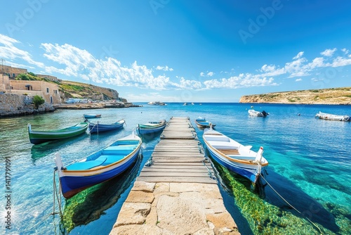 Colorful boats on a wooden dock, crystal clear water, sunny day