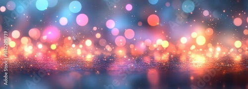 Colorful bokeh lights sparkle softly against a blurred backdrop, creating a serene, enchanting ambiance reminiscent of twilight celebrations. The pastel hues blend beautifully