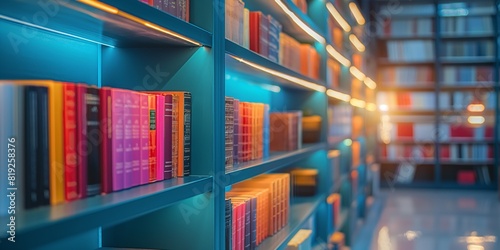 Colorful books on illuminated shelves in a modern library interior, creating a vibrant and inviting reading atmosphere.