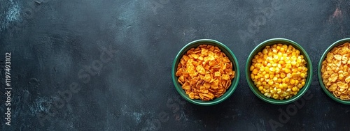 Colorful bowls of lentils and grains on dark background with Copy Space for text placement
